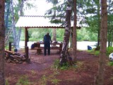 Стоянка очень удобная: больше всего нас подкупил основательный навес с шиферной крышей, есть также длинный стол с лавками, шикарное костровище.