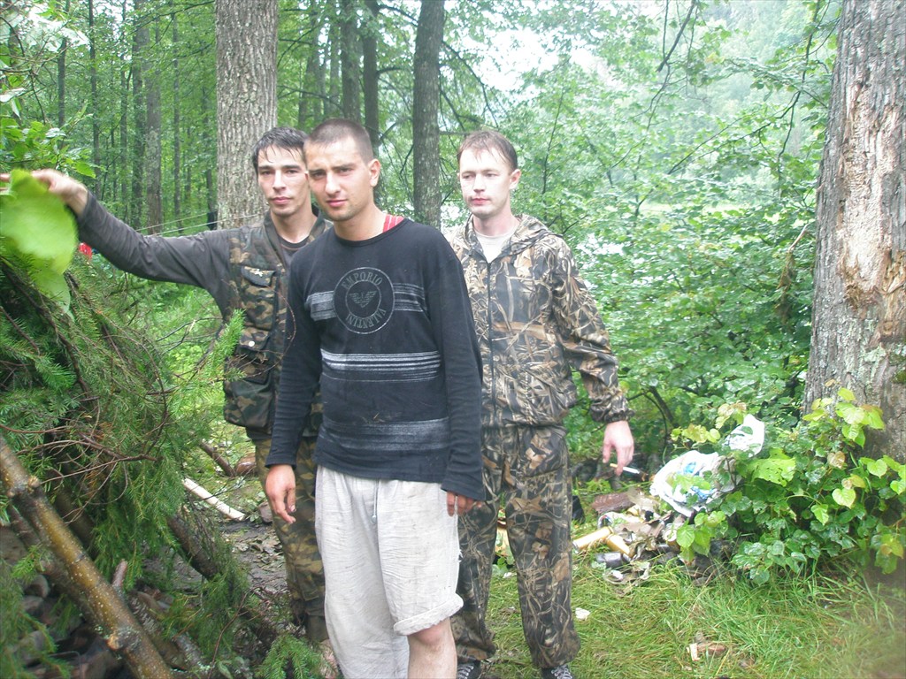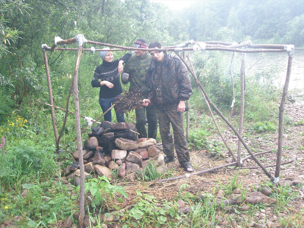 Пришлось делать шалаш что бы дождь не потушил все, ну и вещи высушить