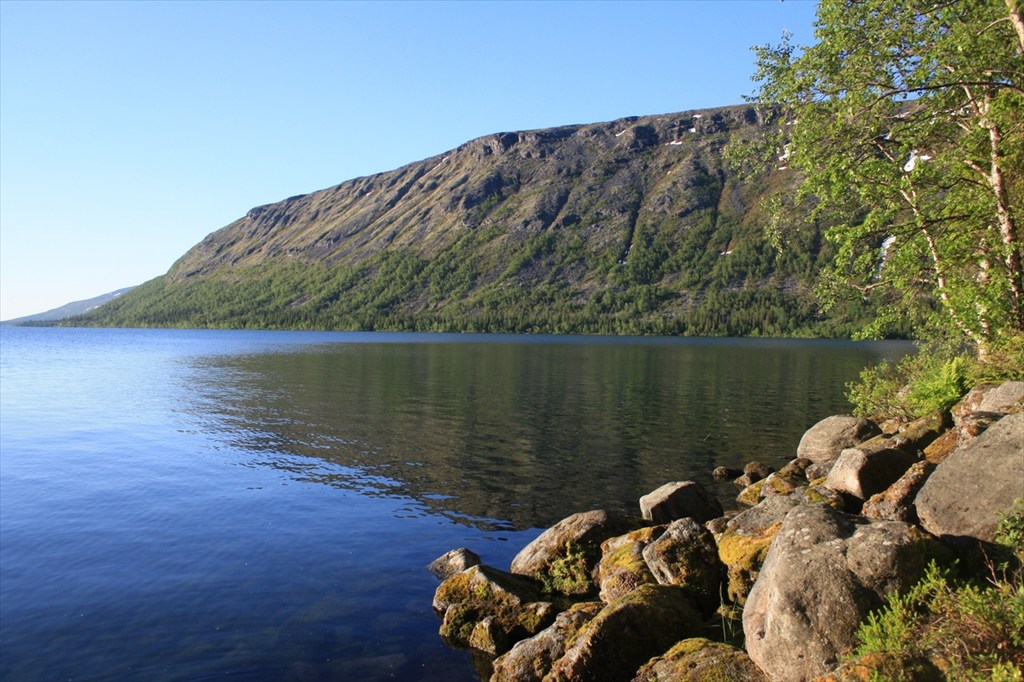 Полярный день, но все равно рассвет - солнце поворачивает из-за гор и освещает озеро. Очень красивое и теплое время.
