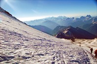 3-его достаточно выспавшись к обеду мы начали спуск в Азау. В последний раз оглядываясь на Эльбрус, я попрощалась с ним мысленно, но уходить совсем не хотелось. Поэтому обратно шла медленно, в душе стояла небольшая грусть, а во вчерашнее восхождение пока не верилось. Действительно странное ощущение, очень долго ждала….а вот уже спускаюсь обратно.