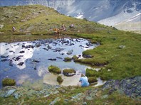 Первая около 17 ч выбирается на перевал Аня. С перевала открывается вид на Аккемский ледник, Белуху, освещенные солнцем вершины и маленьких человечков внизу на леднике. Седловина перевала очень узкая, человека на три, от силы четыре. В туре записка от киевской группы, которая проходила перевал буквально накануне вечером. Причем эта группа тоже спускалась с пер.Новосибирцев. Странно, что мы не видели ни их самих, ни их следов (только непосредственно на подъеме на Титова).