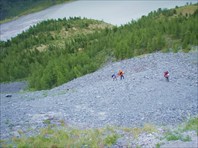 Спуск по осыпи средних размеров крутизной до 350 на лед.Аккемский, 400 м |