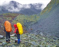 Спуск с перевала по узкому осыпному кулуару (разрушающиеся скалы) крутизной до 40-450, 20 м | 1 ч 30 мин |