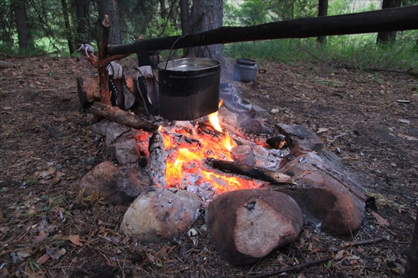 А когда-то это была деревня, здесь было водохранилище с плотиной. Сейчас ни того, ни другого. Стоит один дом, из которого обитаема только половина. Хозяин посоветовал не шибко шастать в прибрежных кустах, а ходить на речку по тропе, так как в это лето змей как грязи. Мы перешли по тропинке полянку и зачалились на уже традиционной для этого места стоянке. Первым делом пока не остыли, залезли в реку. Всё таки купаться, в смысле не поплавать, а именно купаться в плане помыться, на закате в горной речке, одно удовольствие. Не купаться - другое. Но костёр и горячий ужин быстро поправили эту маленькую неудобность.