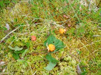 Утром проснулись в 8.30., для Сер – что-то невероятное. Очень скоро подъехал «жигуль» со сборщиками морошки. Утренняя хмарь разошлась. Сер залез под машину, т.к. ремонт оказался не ремонтом: рычаг ходит легко, но повышенная так и не включается. Бедный, в жаре, в комарах, после колы – лучше было бы отдать деньги и не мохаться самому. Но отдавать некому. Морошатники прошли мимо в другую сторону, не видно, чтобы их ведра были тяжелыми. Вернулись. Сказали, что в этой стороне ягод нет. Я полюбовалась на полведра морошки, сфотографи-ровала. Они уехали, Сер под машиной, а я пошла не в ту сторону. Зато видела бобровые каналы, бассейны. Когда вышла на нужное болото, оно было все истоптано вдоль и поперек и я не рассчитывала набрать хоть сколько. Но мало-помалу ягоды стали находиться, банка наполняться. Вернулась, потому что по пасмурному небу ориентироваться было невозможно, оставляла себе время на плутание. Но вышла правильно. Вышла вдвойне правильно, т.к. Сер уже, оказывается, помирал с голоду. Пообедали, Сер лег в машину, я покемарила на коврике у двери в прямом и переносном смысле. Обрезала другую бутылку и пошла за морошкой. Казалось, по дважды хоженому месту ничего не найти, но второй литр тоже набрался, и хорошо, что литр, а не больше, ноги гудят, по кочкам напрыгалась. Уже шла к мосту, как на дерево взлетела здоровая тетерка, взлетела и растворилась.