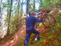 Очередная разведка показала, что подыматься прямо вверх по склону нельзя, дальше он становится очень крутым. Остается вчерашний второй вариант – траверсировать склон на северо-восток до вершины гребня, где по нашему предположению должна быть тропа. Пройдя порядка 400 м на северо-восток и вверх (фото 67), мы вышли на то, чего искали – гребень и тропа, видимо, от водопада (только у водопада мы почему-то ее не нашли). Каменистая тропа довольно круто уходила вверх по гребню, на ней встречались упавшие деревья, но идти по ней было заметно легче. Средний уклон 200 (по карте).