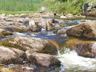 Вышли в 9ч. Воды очень мало, перекаты идут один за другим, с большим перепадом, быстро теряем высоту. Иногда сплошные камни, не видно главной струи, а деваться некуда - тащим лодку вперед, как Мюнхаузены. Река красивая, чистая, веселая, если бы дождик прошел и на 0,5м воды прибавилось...