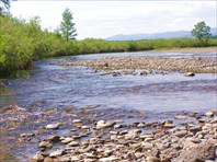 Несколько раз снимали рюкзаки и перетаскивали сначала их, потом лодку. Конечно, кильсон в лодке снят. Спокойные глубокие участки небольшие. Мечтаем выйти из гор на болота. Примерно через 10км выходим на равнину, река еще больше размазывается, и мы немилосердно дерем лодку на шкуродерах. Сами мокрые, в лодке полно воды, перекусочная сумка в носу плавает под ногами. Волк несколько раз падал прямо лицом в воду, и я тоже. Идем на пределе, но двигаемся. К вечеру холодает, начинаю замерзать. Уже часам к 9 вечера вышли к избушке, туда только что приехали 2 рыбака на мотоциклах, рядом пасется лошадь. Мне не до знакомства, мокрая, замерзшая, измученная, скорее бы встать на стоянку, переодеться в сухое, и комары уже заедают, но Волк бежит с ними здороваться и подробно рассказывать кто мы и откуда. Рыбаки только лениво удивляются, как мы сюда добрались, мы их мало интересуем.